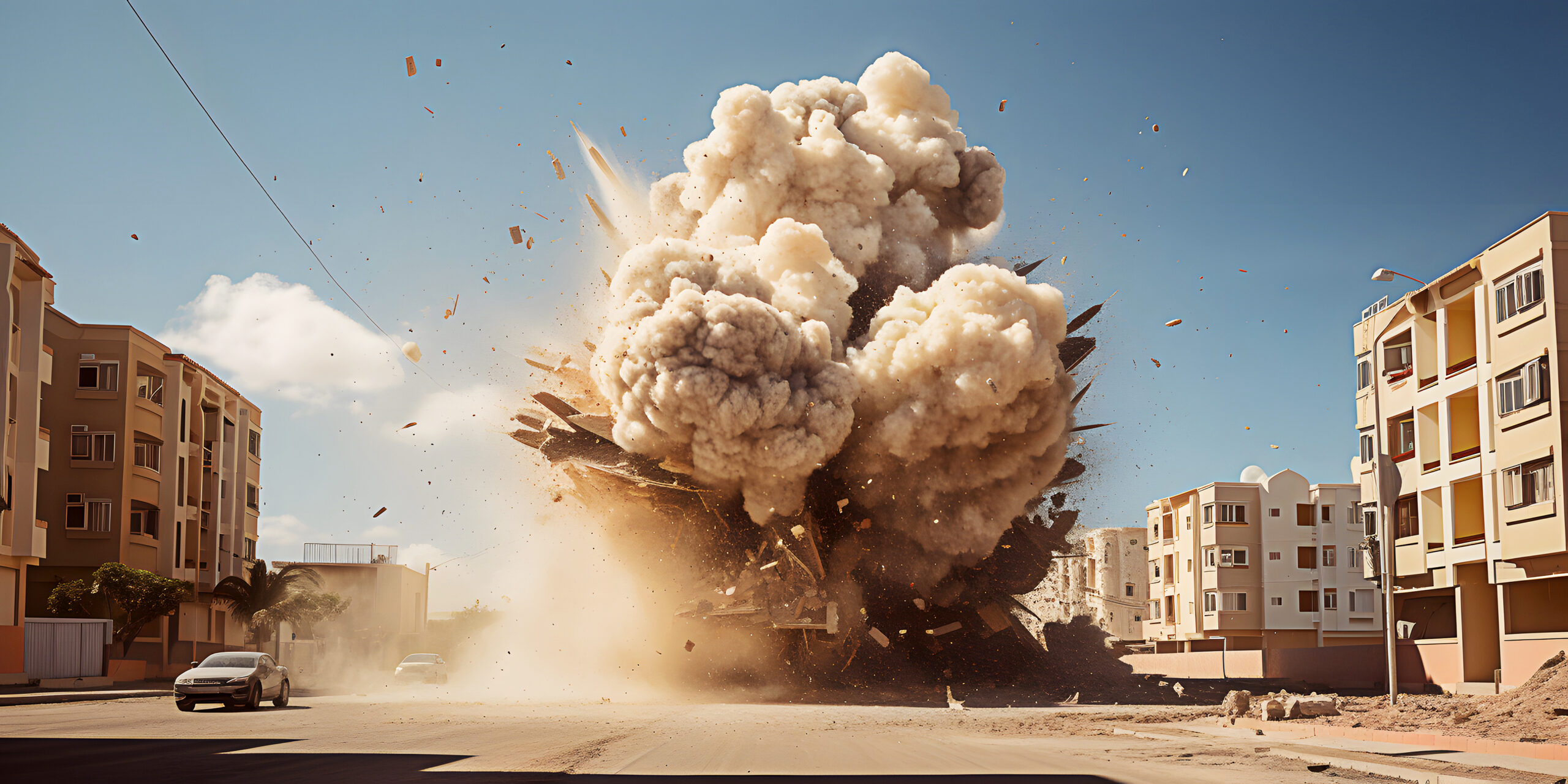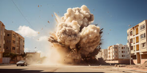 Dense clouds of smoke at residential district of town street after bomb explosion
