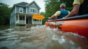 Flooding 2025. Rescuers in an inflatable rescue boat with the text ‘Rescue’ approach a flooded house to save residents trapped inside due to high water. AI-generated image