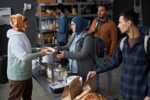 Group Of People Receiving Meals at Soup Kitchen