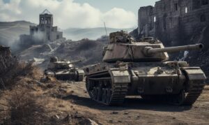 Tanks in ruined city street